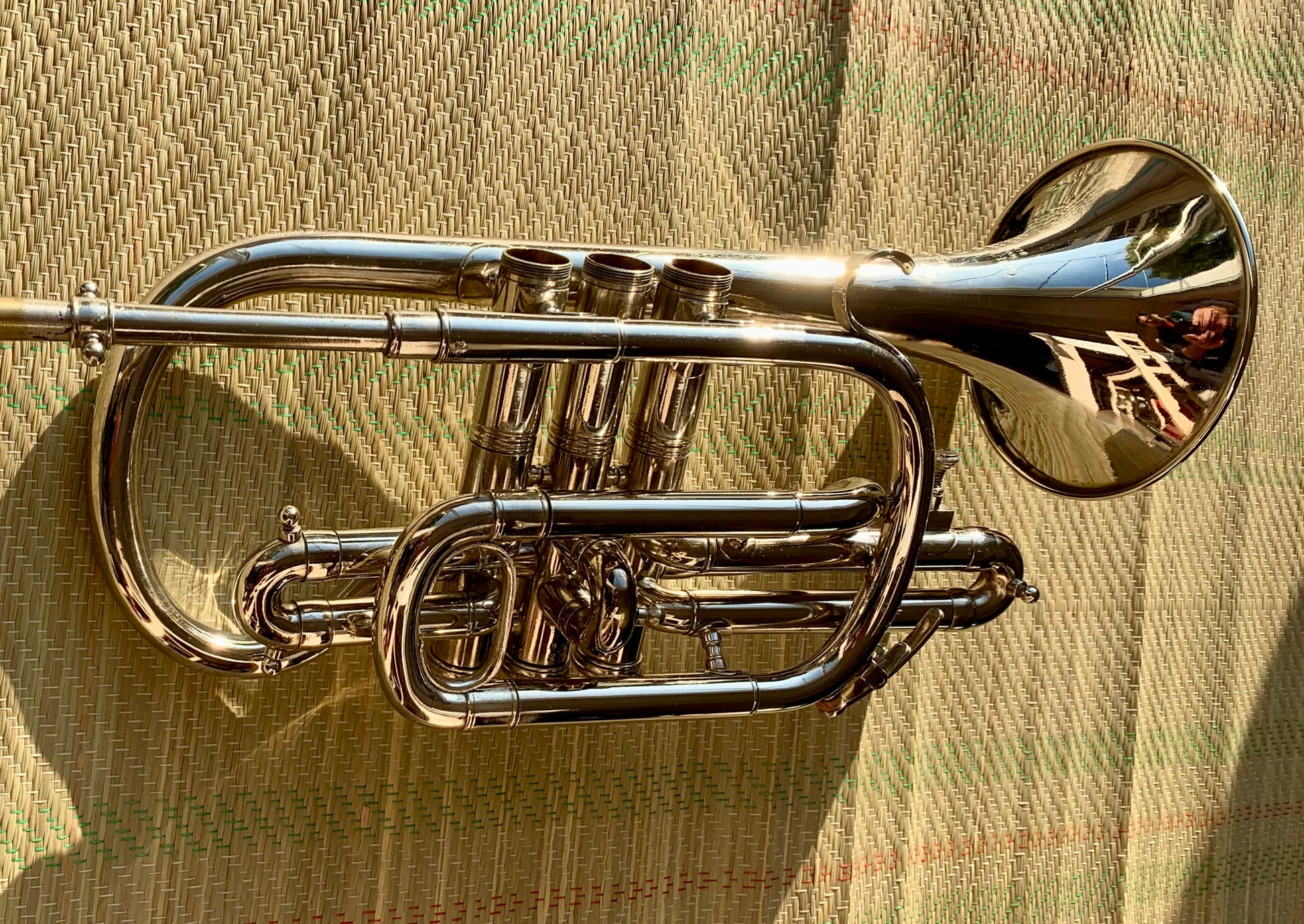 Cet instrument est entièrement nickelé. Il a eu droit à une cure de jouvence! Tous les pistons et coulisses sont libres. Les feutres ont tous été remplacés par du flexible imprimé en 3D, une innovation Re-Brass!