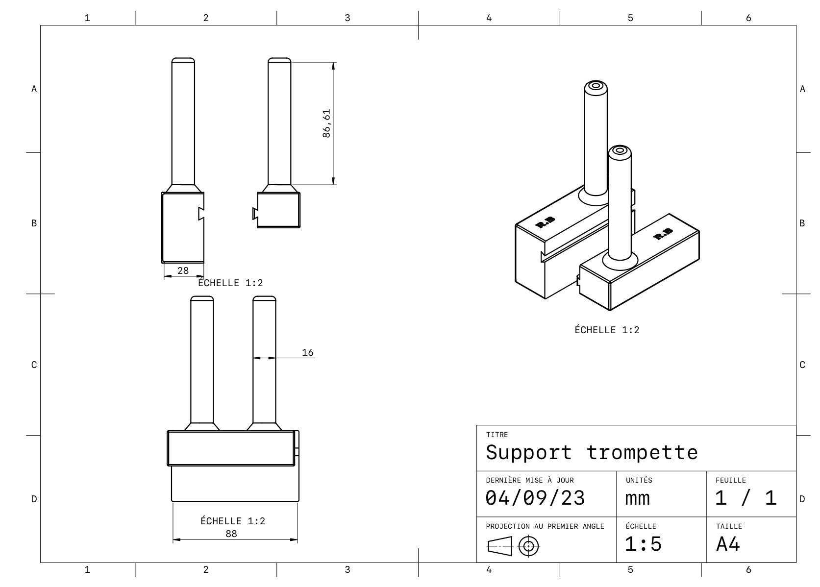 Les 2 tubes de diamètre 16 mm sont équipés d’un trou à fileter diamètre 5 mm. vous pouvez ainsi saisir votre trompette afin qu’elle ne tombe pas si vous avez besoin de la positionner à la verticale. 😮💨